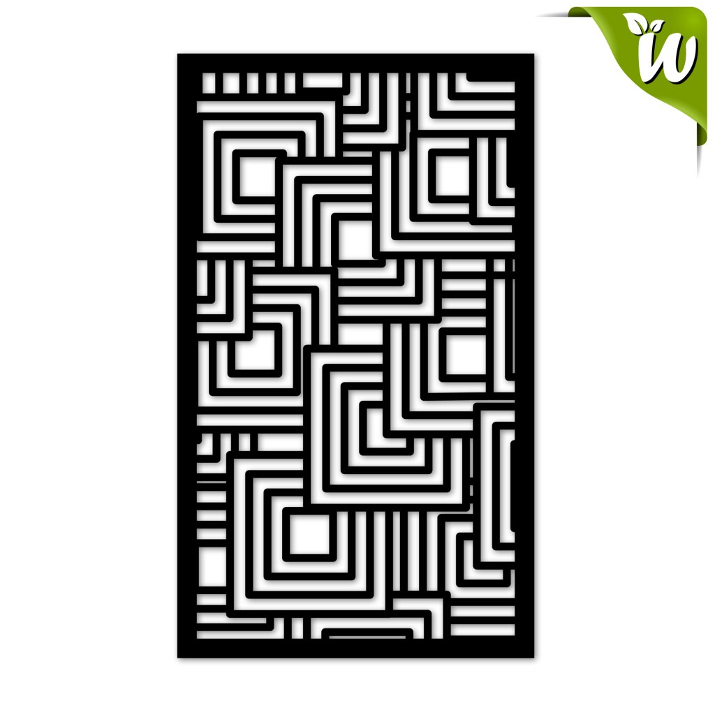 Dřevěný obraz čtverců je vyřezaný laserem, poté ručně obroušen a nakonec obarven na černo. Uchycení je vyřešeno oboustrannou lepící páskou, která je součástí balení.