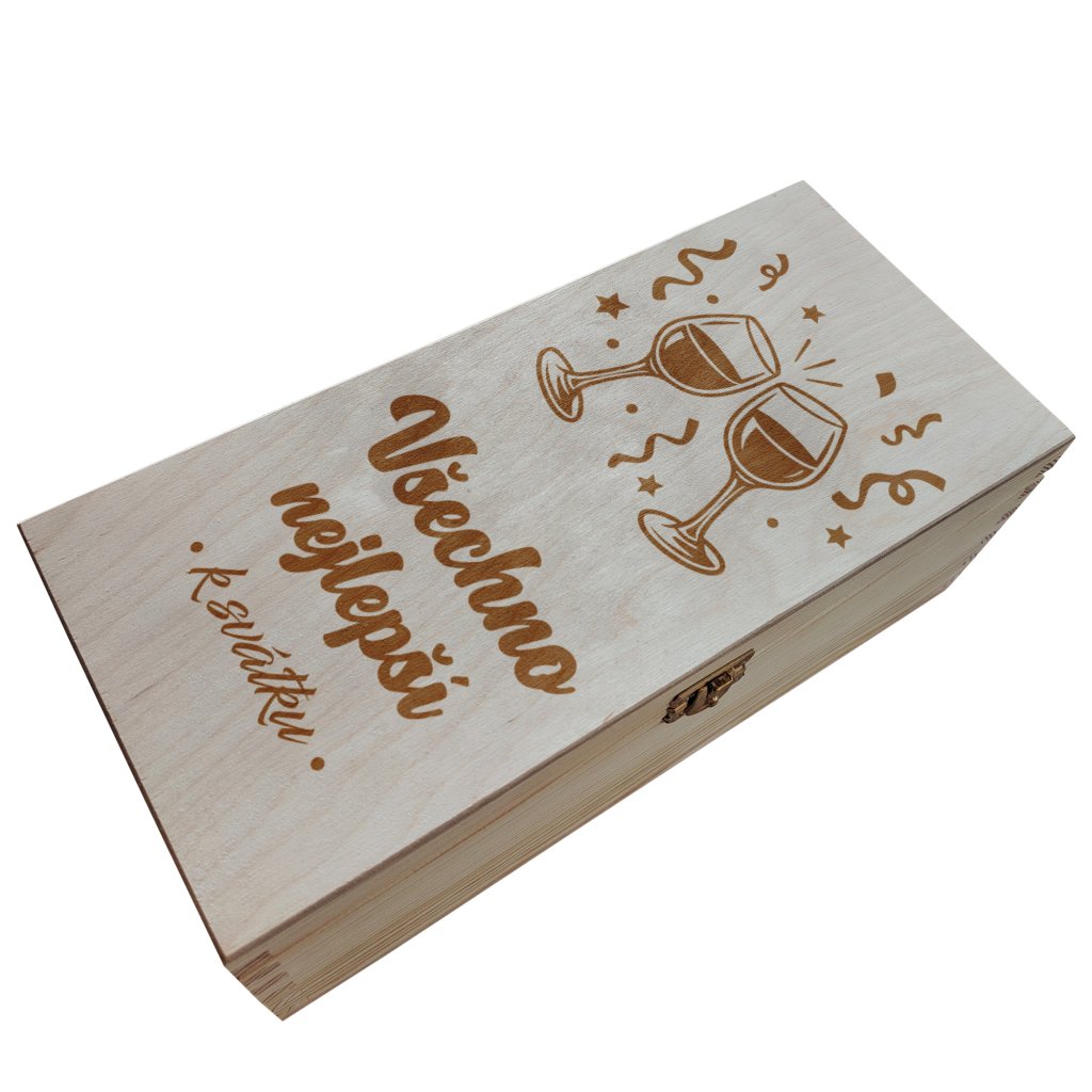 Originální dárková krabička na láhev alkoholu, která potěší každého oslavence. Na víku je vygravírovaný veselý motiv se sklenkami vína a přáním „Všechno nejlepší k svátku“. Krabička je vyrobena z kvalitního dřeva a díky pevnému zpracování poslouží nejen jako obal, ale i jako stylová úschova na láhev.