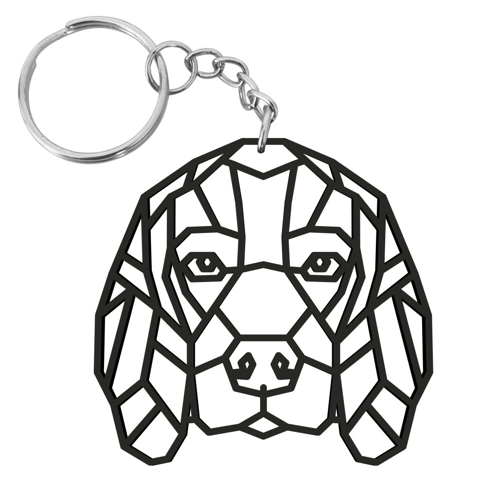 Dřevěný přívěsek psa v polygonálním stylu z březového dřeva s kovovým kroužkem a řetízkem.