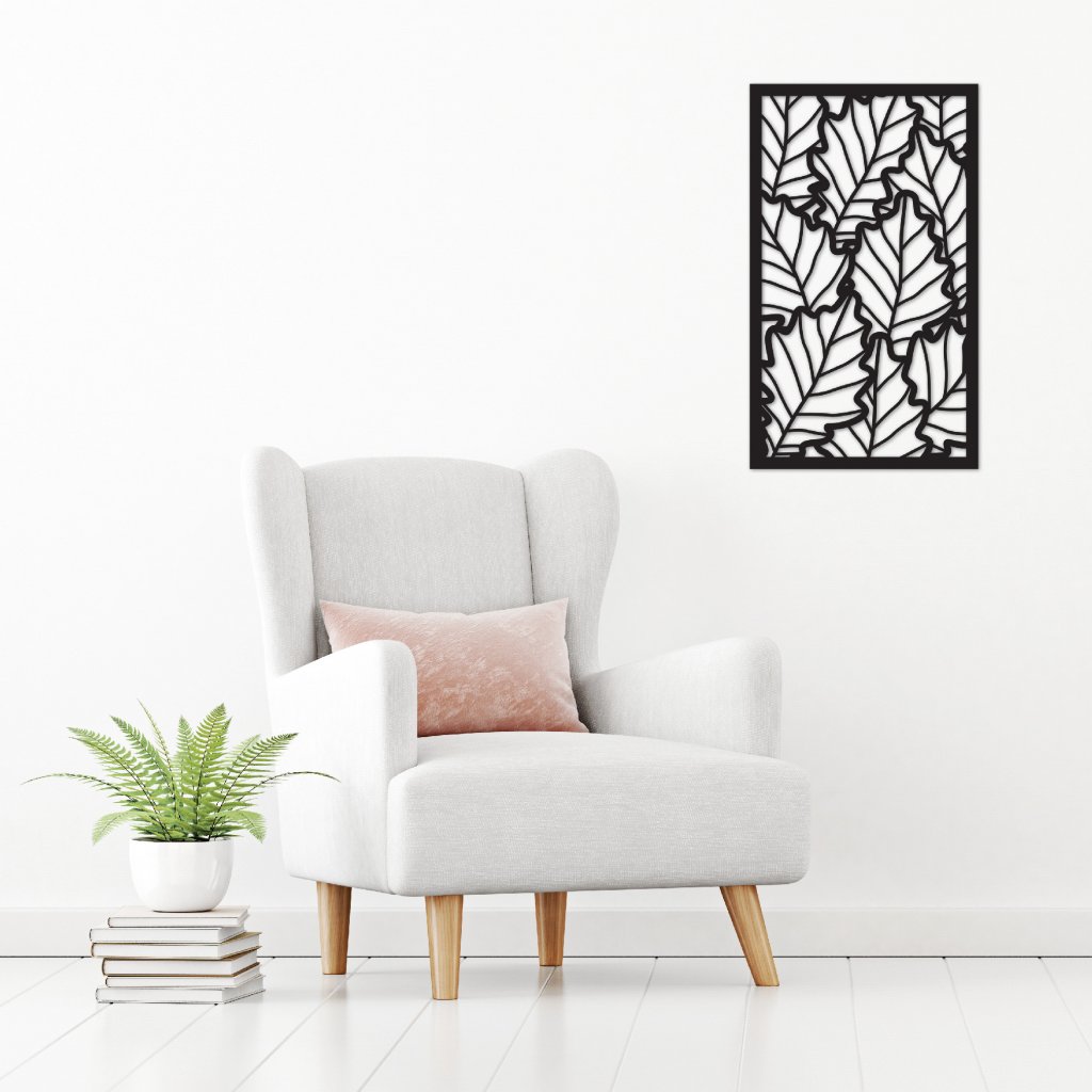 Dřevěný obraz listy je vyřezaný laserem, poté ručně obroušen a nakonec obarven na černo. Uchycení je vyřešeno oboustrannou lepící páskou, která je součástí balení.