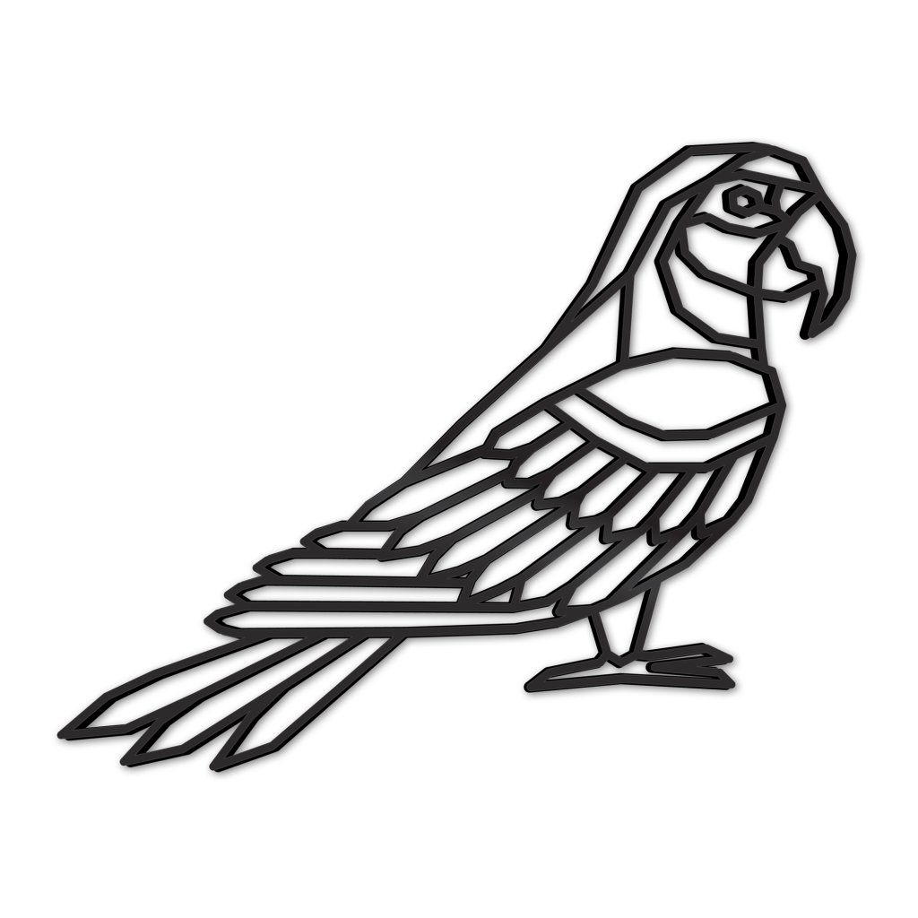 Polygonální tvar papouška je vyřezaný laserem, poté ručně obroušen a nakonec obarven na černo. Uchycení je vyřešeno oboustrannou lepící páskou, která je součástí balení.
