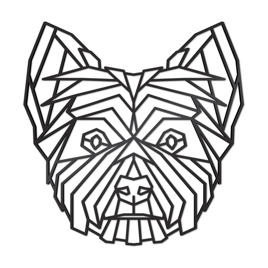 Polygonální tvar psa je vyřezaný laserem, poté ručně obroušen a nakonec obarven na černo. Uchycení je vyřešeno oboustrannou lepící páskou, která je součástí balení.