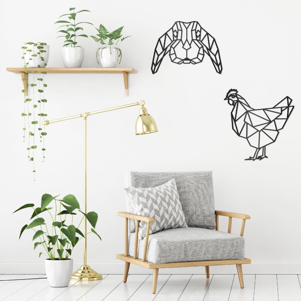Polygonální tvar slepice je vyřezaný laserem, poté ručně obroušen a nakonec obarven na černo. Uchycení je vyřešeno oboustrannou lepící páskou, která je součástí balení.
